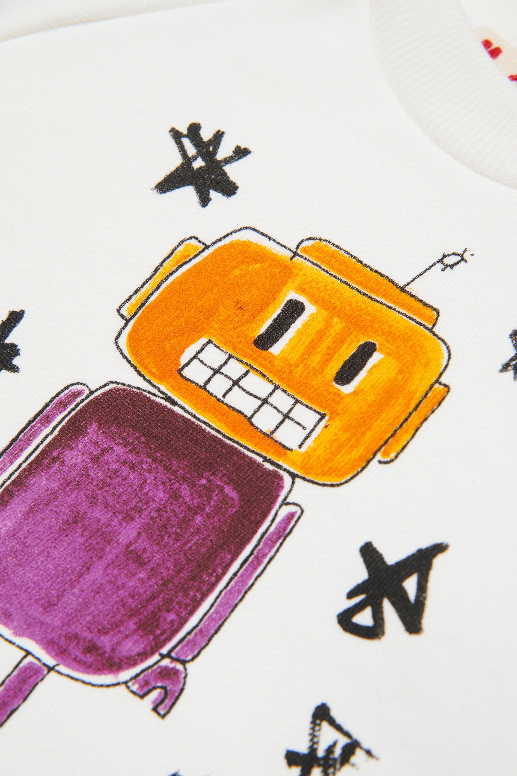 Long-sleeved crew-neck sweatshirt embellished with robot-themed Galaxy graphics on the front and institutional logo. The contrasting color bottom adds a lively touch to this playful and contemporary spirit garment.