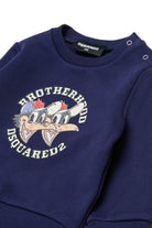 Long-sleeved crew-neck sweatshirt with Dsquared2 Brotherhood print ruined effect. Cartoon-style duck graphic adds a playful touch. Perfect for a casual and original look.