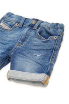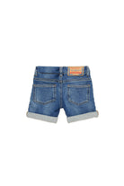 JoggJeans® short pants. Made of soft-handle mid-blue denim, characterised by gradients, whiskers and contrasting coloured seams. Mending breaks with zig-zag on the front. Bottom with roll-up.