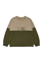 Two-tone crew-neck long-sleeved sweatshirt featuring a re-cut construction typical of MM6. The design simulates the assembly of two deconstructed and reassembled garments resulting in a bold and contemporary look, emphasized by the raw cut bottom.