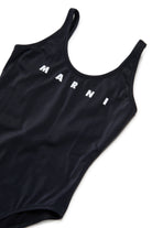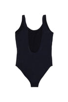 One-piece swimsuit with front logo, featuring thin straps and a deep back neckline