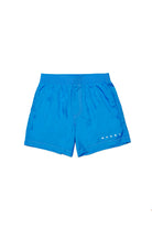 Short boxer swim trunks with logo on the hem. Essential beachwear design with technical details.