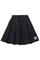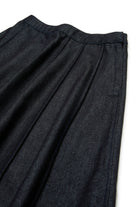 Dark raw denim midi skirt with wedge construction and flared silhouette gives a modern and dynamic feel. Perfect for a variety of occasions, it combines versatility and style with a contemporary design.