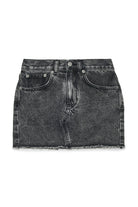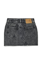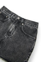 Gray denim mini skirt with contrasting gradients and a raw-cut hem at the bottom. A perfect garment for a modern, punchy look.