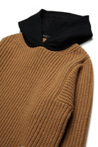 Wool-blend sweater with contrasting color hooded sweatshirt. The rib construction of the body combines with the sporty attitude of the hood, creating a balance between comfort and casual style.