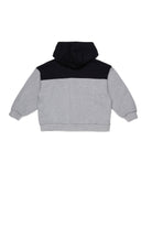 Full zip hooded sweatshirt, contrasting details on shoulders and hood, 100% cotton.