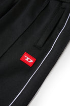Shiny triacetate balloon pants with red D patch and contrasting piping, a fusion of comfort and sporty inspiration. The soft, structured fit is enhanced by front ribbing.