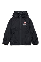 Windbreaker with printed logo on the chest and contrasting details. The design features a fixed hood and a front zip fastening.