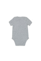 Baby bodysuit with front logo and snap button closure.