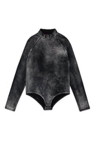 Long-sleeved stretch jersey bodysuit with high neck. Spray-effect mylar print and embossed Oval D logo give an original touch. Comfort and style meet thanks to the practical button closure on the crotch.
