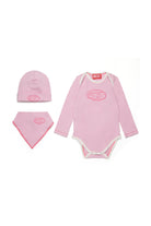 Stretch jersey birth set with matching bodysuit, cap and bib. The kit comes inside an original gift-box.