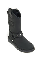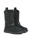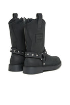 Leather biker boots with studded strap. The printed side label completes the look, making them perfect for those looking for a pair of rock-style boots.