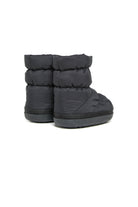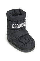 Tall snow boots feature a nylon upper with fake down puffy padding and a rubber sole. They feature a Dsquared2 logo printed in a contrasting color on the upper.