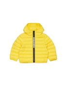 Padded jacket with printed logo, featuring a horizontal quilted design and fixed hood.