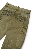 Vintage-effect stretch gabardine cargo pants. A garment with a strong character, with spots of color and the deliberately ruined Dsquared2 logo, perfect for standing out.