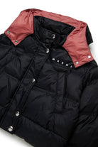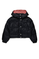 Padded jacket with removable hood. The slightly cropped fit and institutional logo in contrasting color make it a versatile and stylish garment perfect for tackling the winter season.