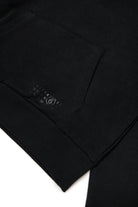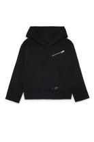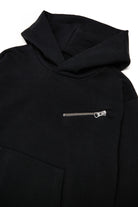 Long-sleeved hooded sweatshirt features raw-cut hems and a heart-side zip pocket. Ideal for a casual and trendy look.