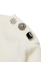 A wool-blend pullover in a reverse-knit shaved knit, combining comfort and style. The three jeweled buttons on the shoulder, each one different from the other, add a touch of elegance and originality, making the garment unique and sophisticated.