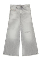 Five-pockets JoggJeans® with flare fit and disc attitude. Medium-waisted. Made of soft-handle light grey denim, distinguished by gradients and color contrasting whiskers. Abrasions and rips accented with zig-zag seams at the front. The design features an adjustable waist and elastic closure.