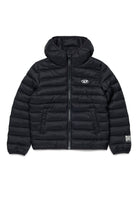 Padded jacket with printed logo and fixed hood. The quilted design enhances the contemporary look.