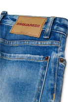 Boss 10 five-pockets jeans with a straight fit. Made of mid-blue denim, distinguished by gradients and whiskers in contrasting colours. Front-back tears and abrasions. Dsquared2 label applied to the flap (flag logo).