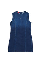 A sleeveless dress in dark blue JoggJeans®, an essential yet richly distinctive design. The color-contrasting gradient wash gives a modern accent, perfect for a variety of occasions.