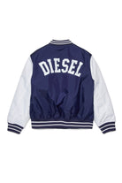 Padded varsity jacket with D patch on the front on the heart side and Diesel logo printed on the back. It features a button closure.