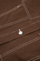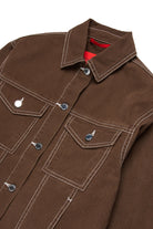 Denim jacket with logo, contrast stitching, and patch pockets on the chest.