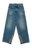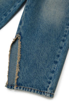 Medium blue shaded regular jeans with raw-cut inner splits at the bottom. A perfect blend of comfort and bold details, ideal for a sophisticated look with character.