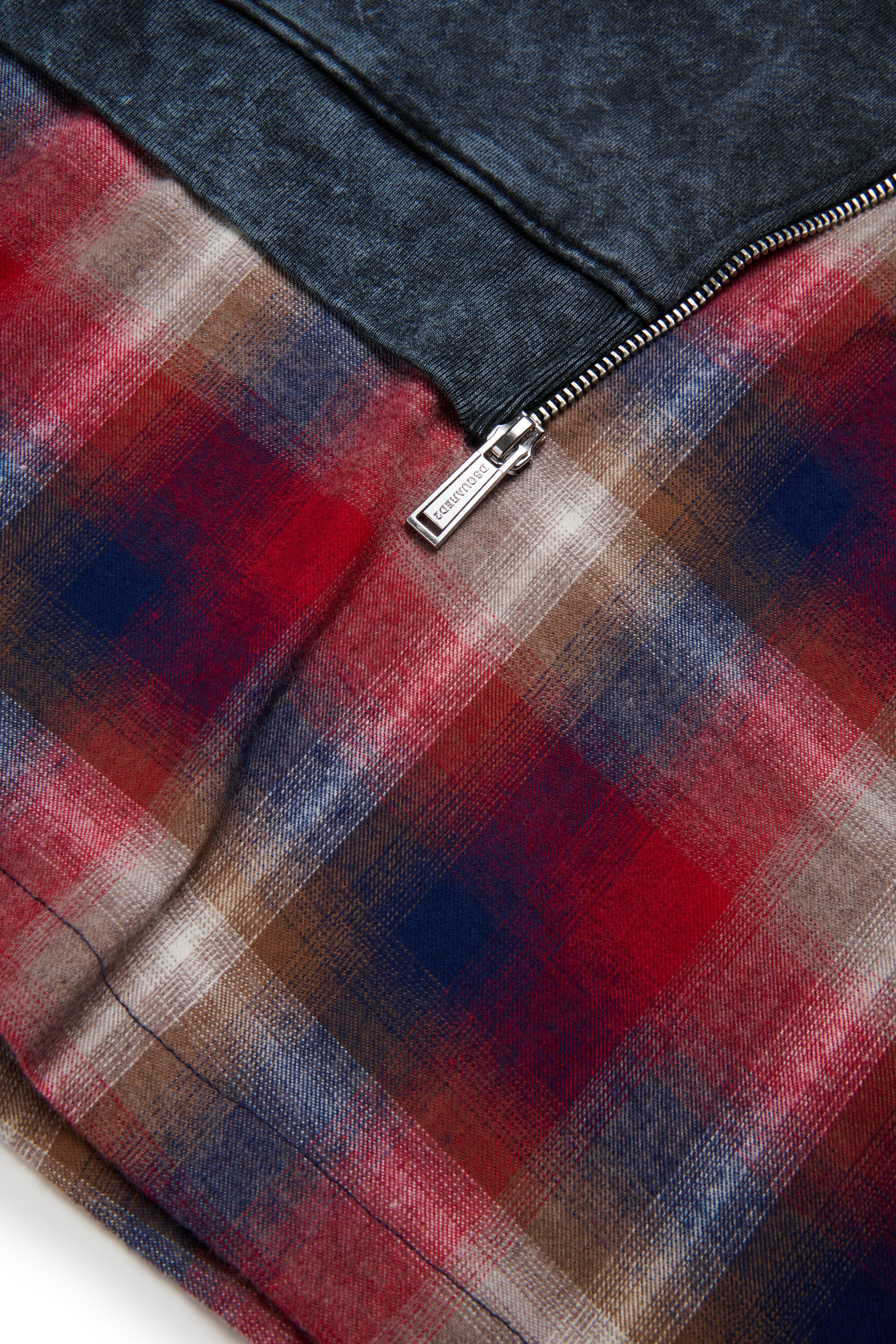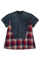 Marbled-effect maxi-sweater dress with checked flannel bottom and back. An original design that plays on contrasting fabrics and aesthetic details such as front zippers to create an urban look with a rebellious spirit.
