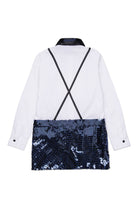 Mini dress with an original design: the upper part recalls a shirt, while the lower part a gabardine mini skirt with suspenders enriched with sequins. A striking garment, perfect for young and bold outfits.