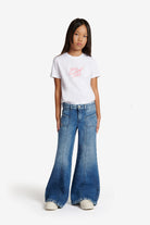 Flare fit jeans in medium blue denim, five-pocket design with vertical stitching and back patch.