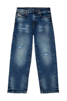 Relaxed jeans with used effect, destroyed details, and contrasting stitching