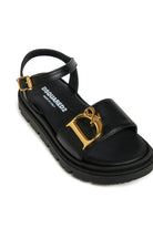 Platform sandals with belt. Personalised with D2 metal plate. Dsquared2 logo in contrasting colour on the insole. Calf leather upper and inner lining. Thermoplastic rubber platform sole. Made in Italy.
