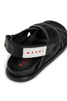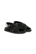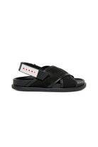 Crossed fussbett sandals. Institutional logo ribbon patch applied to the strap. Strap closure. Mesh and calf leather upper. Thermoplastic rubber sole. Made in Italy.