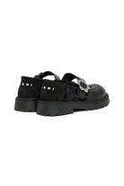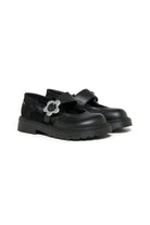 Mary Jane shoes with a flower-shaped buckle and logo on the heel, made of a refined mix of grained leather, suede and pony skin. An elegant and original design for a comfortable and versatile shoe.
