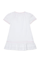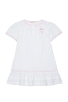 Dress with embroidered logo and contrasting details. The design features short sleeves and a ruffled hem. The craftsmanship stands out for its cotton-linen blend fabric, ideal for a fresh look.