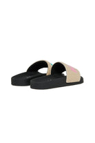 Slide sandals with colorful lettering applied on the strap and contrasting sole.