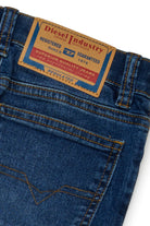 Slim-fit jeans in medium blue denim with contrast stitching.