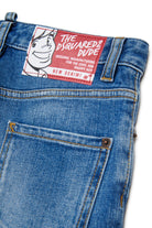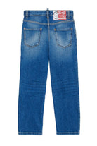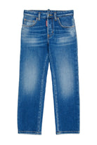 Five-pockets jeans model 642 in a straight fit. Made of medium blue denim, distinguished by contrasting colour gradients, whiskers and small abrasions. Dsquared2 label applied to the flap (flag logo).