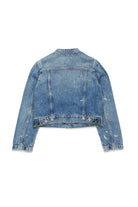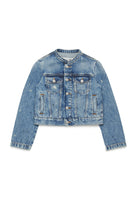 Blue denim long-sleeved jacket with color contrasting gradients. Characterised by the 'color spots' treatment carried out by hand. Button closure. Mandarin collar. Breast pockets and welt pockets on the front. Iconic seam at the back. Made of 100% cotton. Any differences between the photographed garment and the one you will receive are a symbol of the fine workmanship, quality and uniqueness of the product.