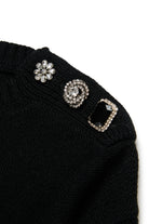 A wool-blend pullover in a reverse-knit shaved knit, combining comfort and style. The three jeweled buttons on the shoulder, each one different from the other, add a touch of elegance and originality, making the garment unique and sophisticated.