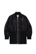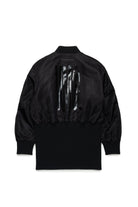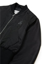 Nylon-twill long bomber jacket. Institutional logo with shiny effect on the front on the heart side and in a maxi version on the back. Front flap pockets. Front zip closure. Elastic on collar, cuffs and hem. Iconic seam at back. Lined inside.