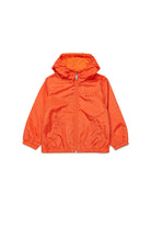 Windbreaker with printed logo, fixed hood, and clean lines.