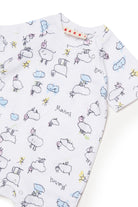 Newborn cotton set with logo and all-over sheep print, consisting of bodysuit, bib, and hat.