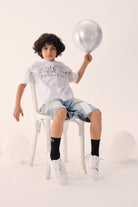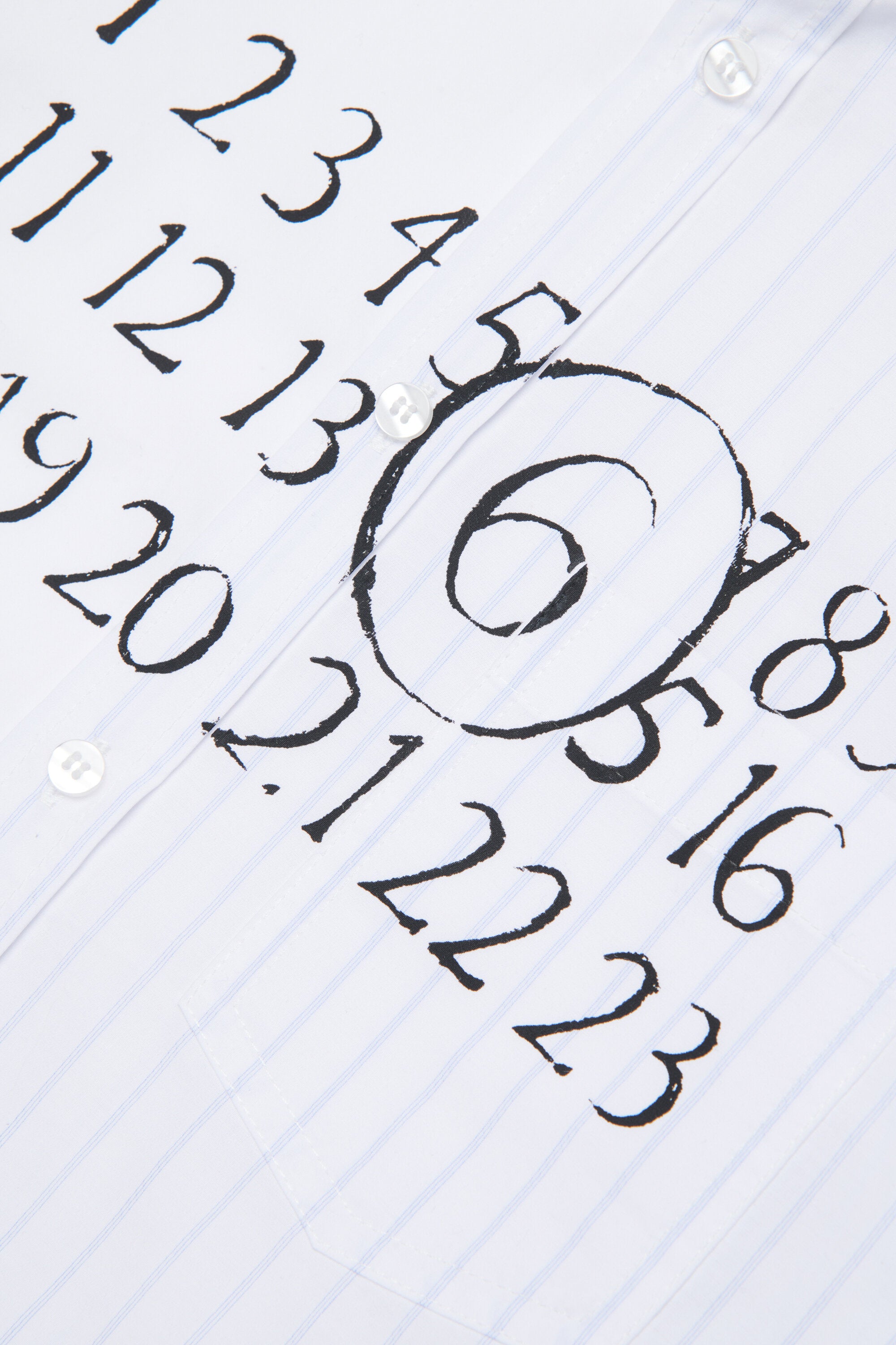 Short-sleeved shirt with printed logo and front numerical motif. The style features a bicolor design with one half in fine stripes and the other in a solid color.