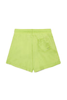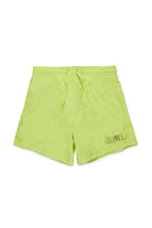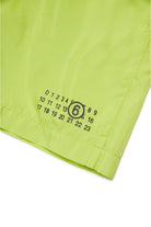 Nylon boxer costume. Short length. Drawstring waist. Numeric logo in contrasting color on front and back. Mesh inner briefs. Front welt pockets. Back pocket. Iconic seam at back.