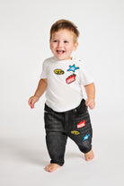 Regular jeans in black denim with applied patches, contrast stitching, and label on the back.