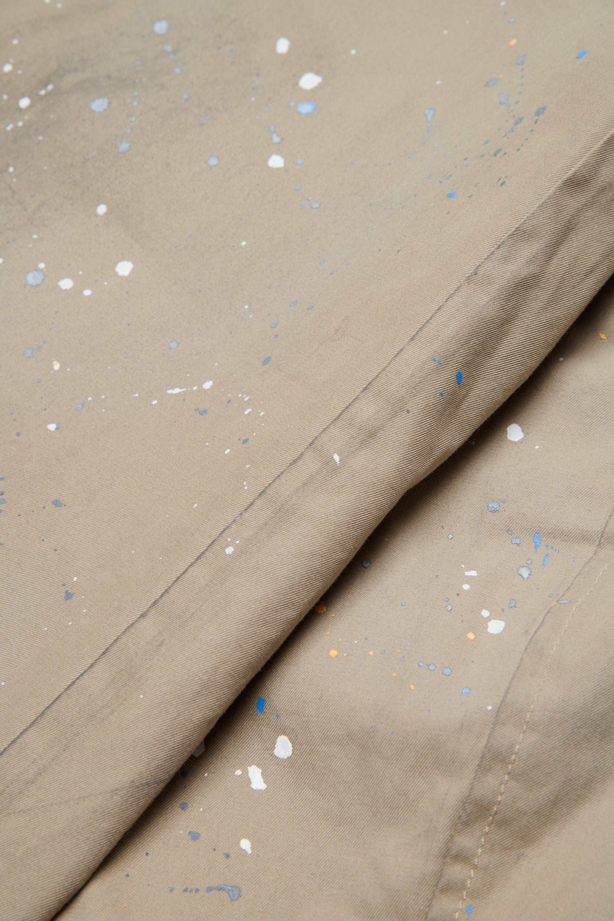 Trench coat with printed logo, knee length, and paint splatter effect print. The signature back stitching gives the piece its distinctive character.