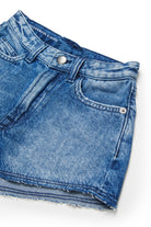 Light blue denim shorts with contrasting stitching and frayed hem.